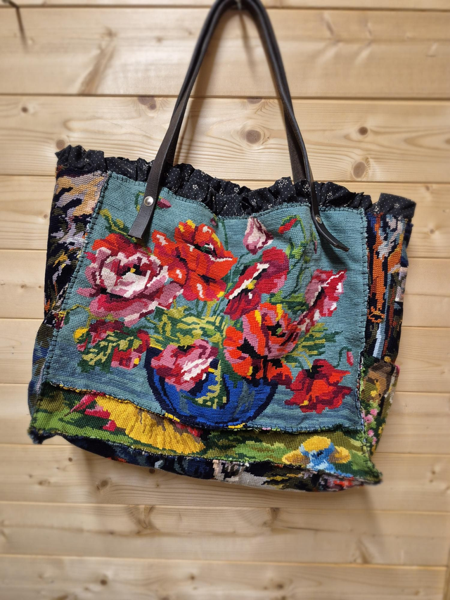 Sac cabas réalisé entièrement à la main avec des matériaux recyclés .