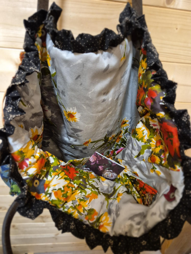 Tous mes sacs sont doublés avec des tissus anciens et molletonnés ce qui leur confère une certaine tenue , une poche extérieure sur le coté pour le téléphone ainsi qu'une poche intérieure.
