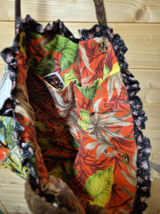Tous mes sacs sont doublés avec des tissus anciens et molletonnés ce qui leur confère une certaine tenue , une poche extérieure sur le coté pour le téléphone ainsi qu'une poche intérieure.