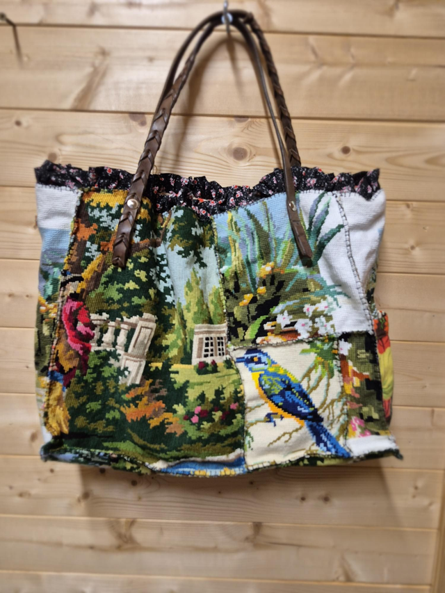 Sac cabas réalisé entièrement à la main avec des matériaux recyclés .