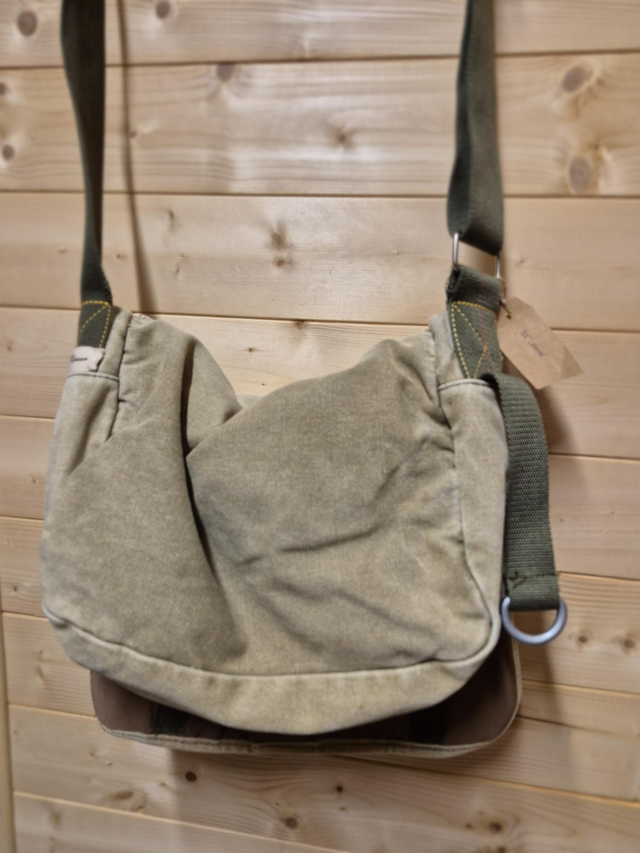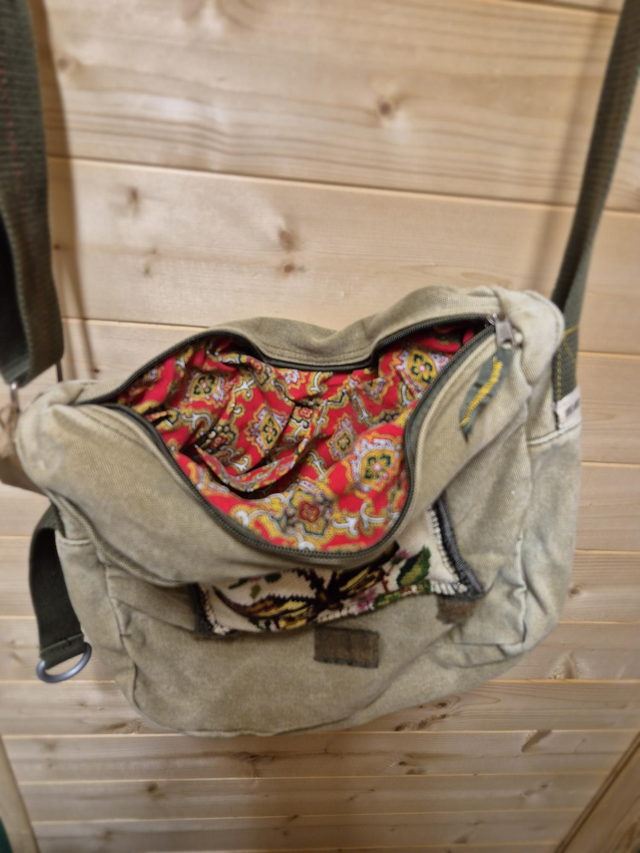 Sac besace réalisé entièrement à la main avec des matériaux recyclés .